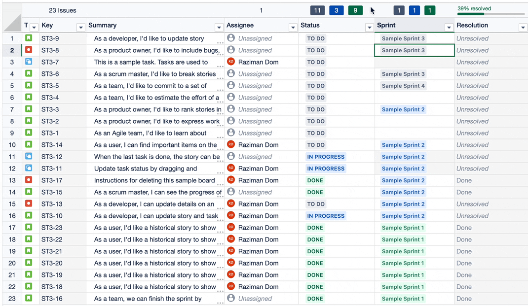 You can swiftly move your Jira issue’s sprint using an Excel-like Issue Editor for Jira. We also highlighted Sprint’s value in 3 colors to give better visibility of Sprint’s status: