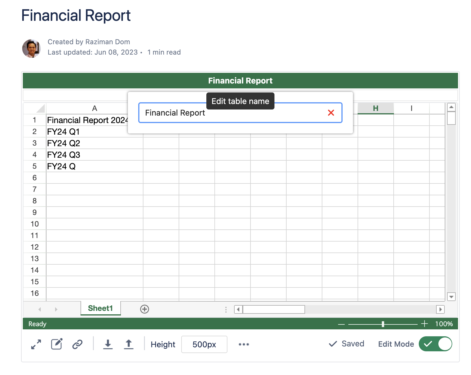 The name table helps users quickly understand the table's content. It will be displayed as the header of the table. Users can modify the table name by clicking it, and then a dialog will be shown on the screen.