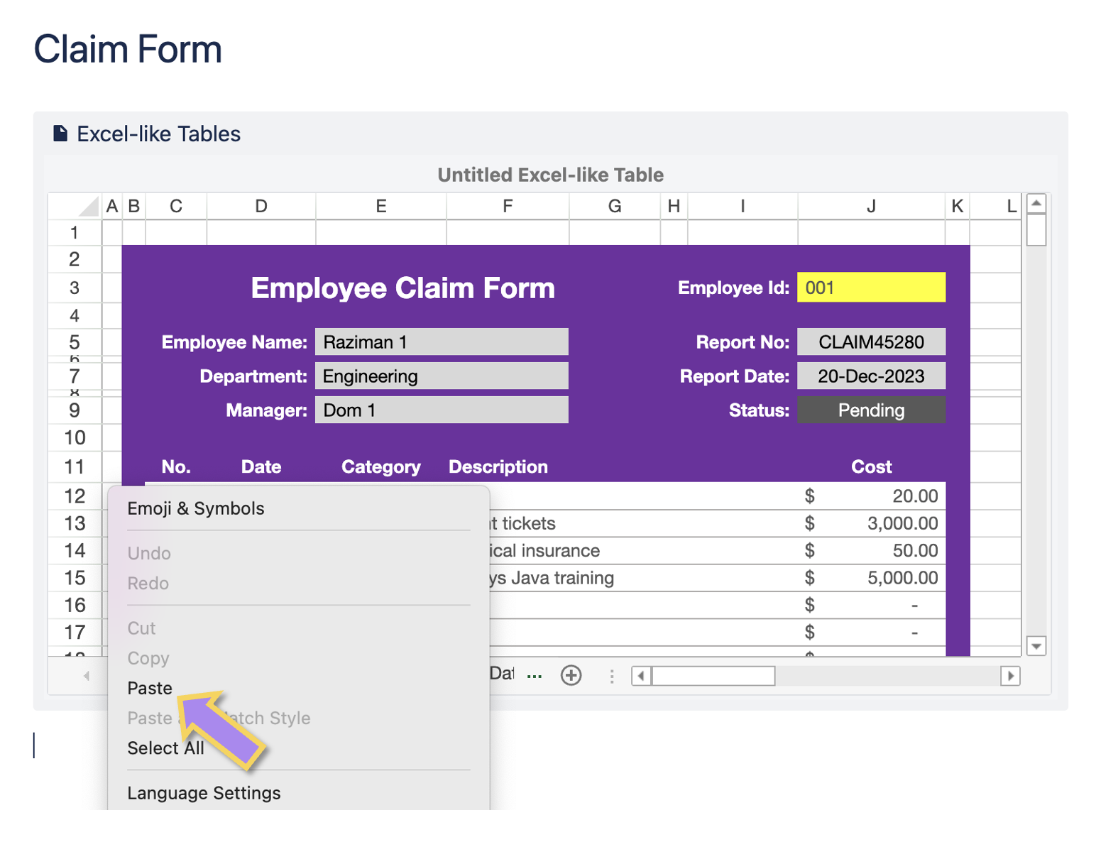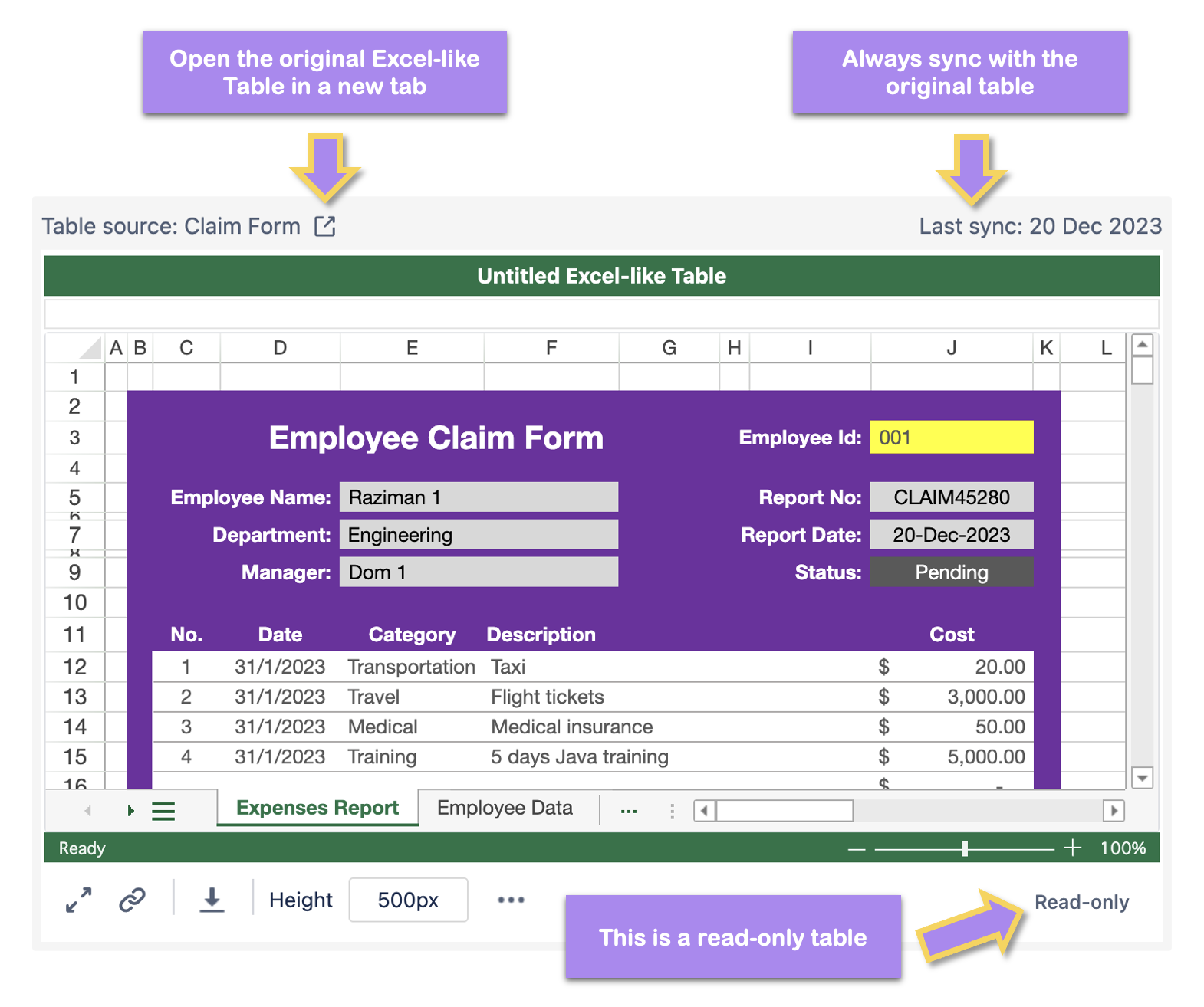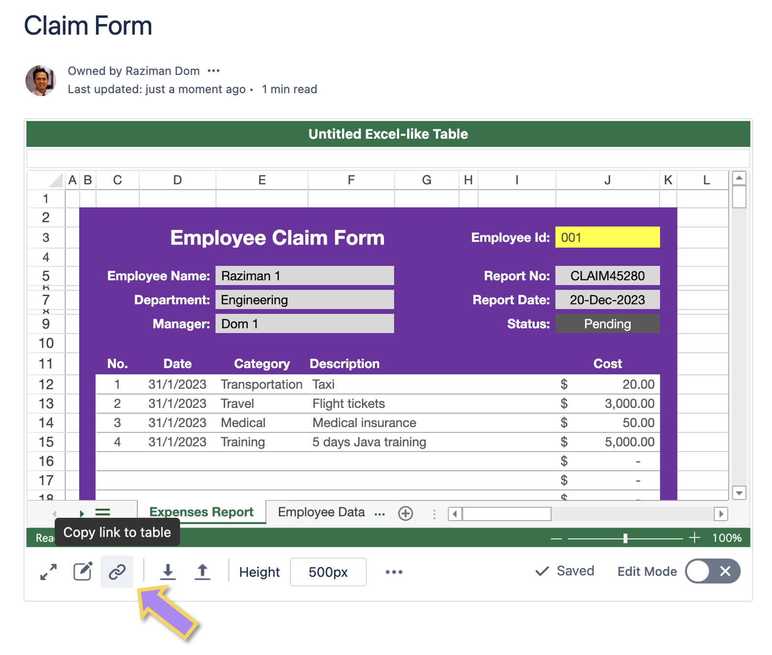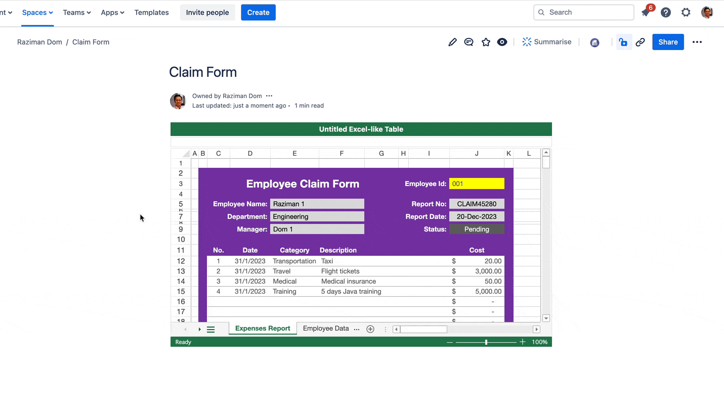 By copying and pasting the Excel-like table URL into the Confluence page, you can create an embedded read-only table. This feature is useful for sharing your table and syncing it across multiple Confluence pages.