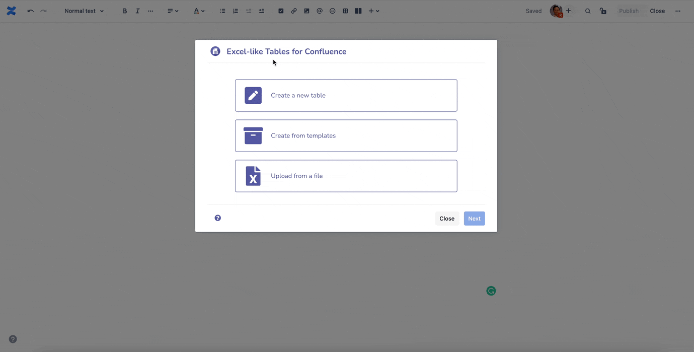Go to any Confluence page, then click the Excel-like Tables for Confluence icon at the top right menu. The app dialog will be displayed, and you choose how you want to create the table.