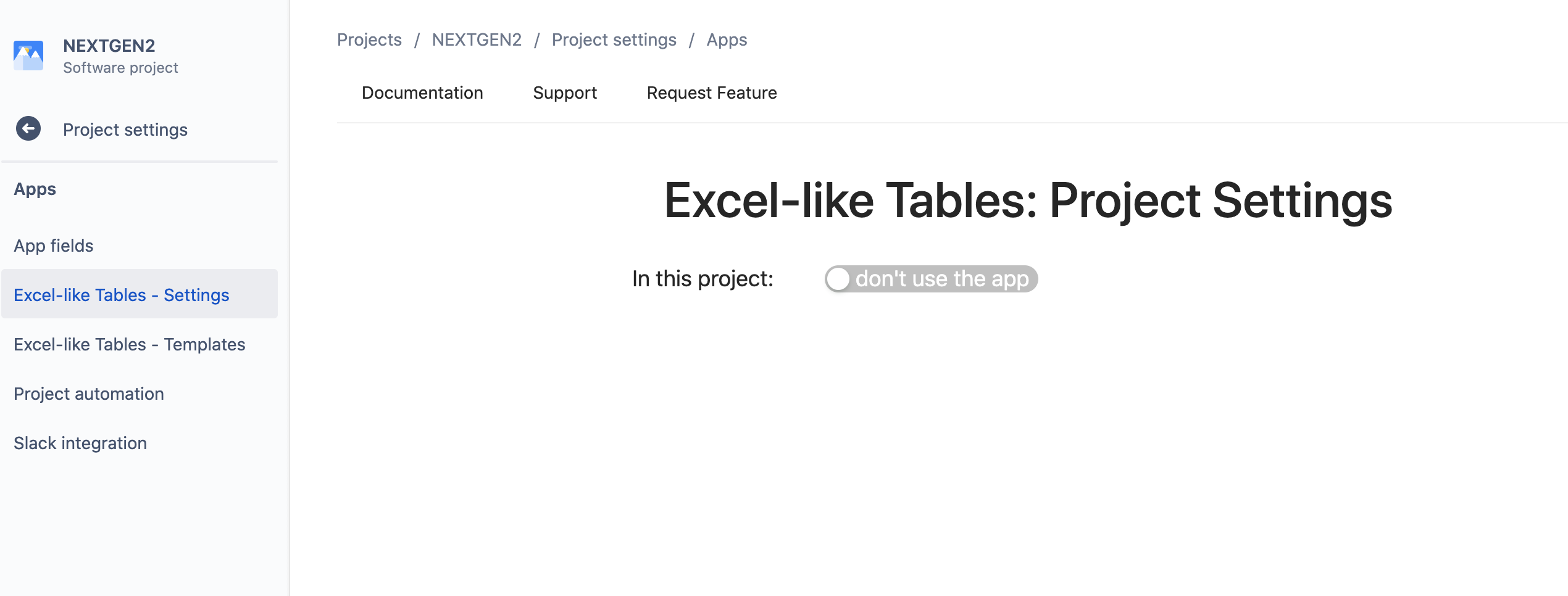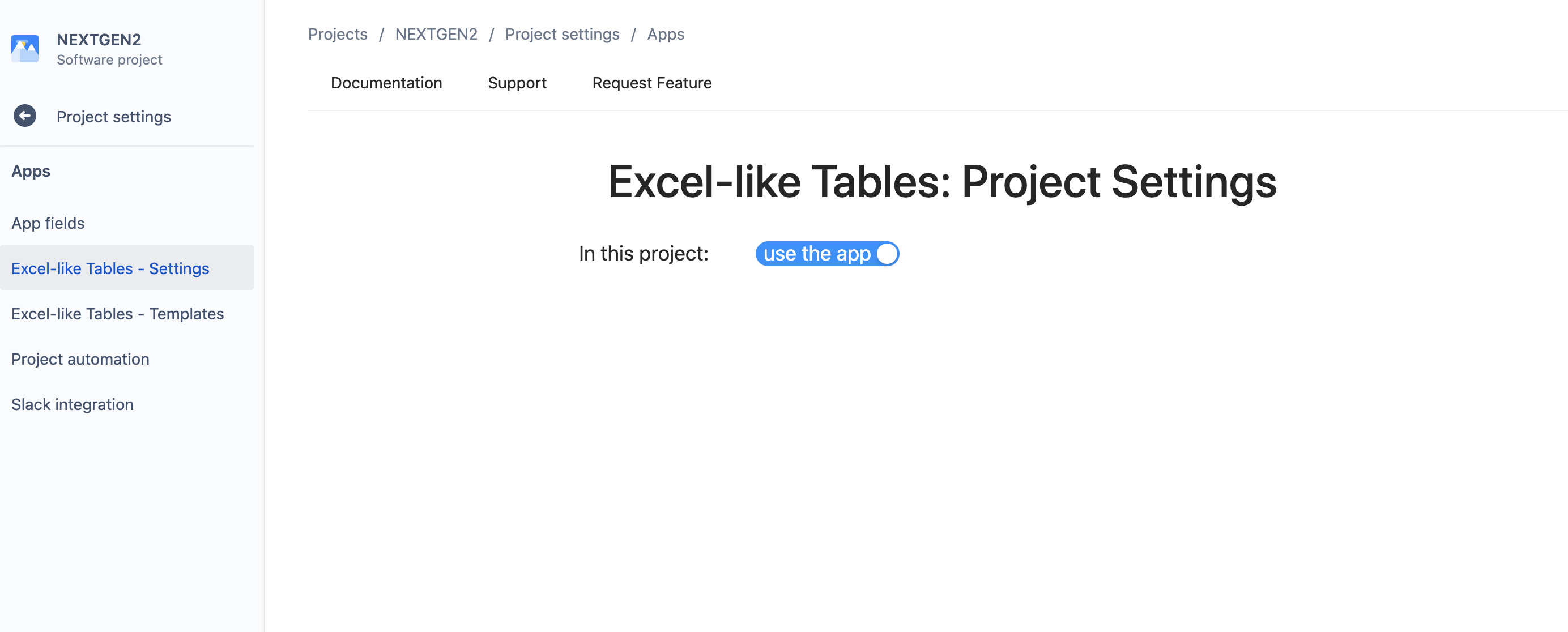 Project > Project settings > Excel-like Tables - Settingsfor the team-managed project: