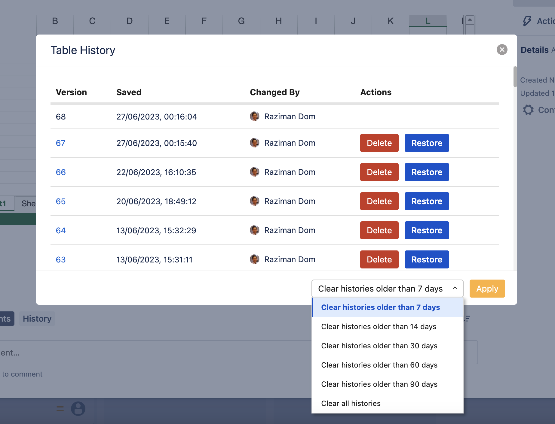 The table history dialog