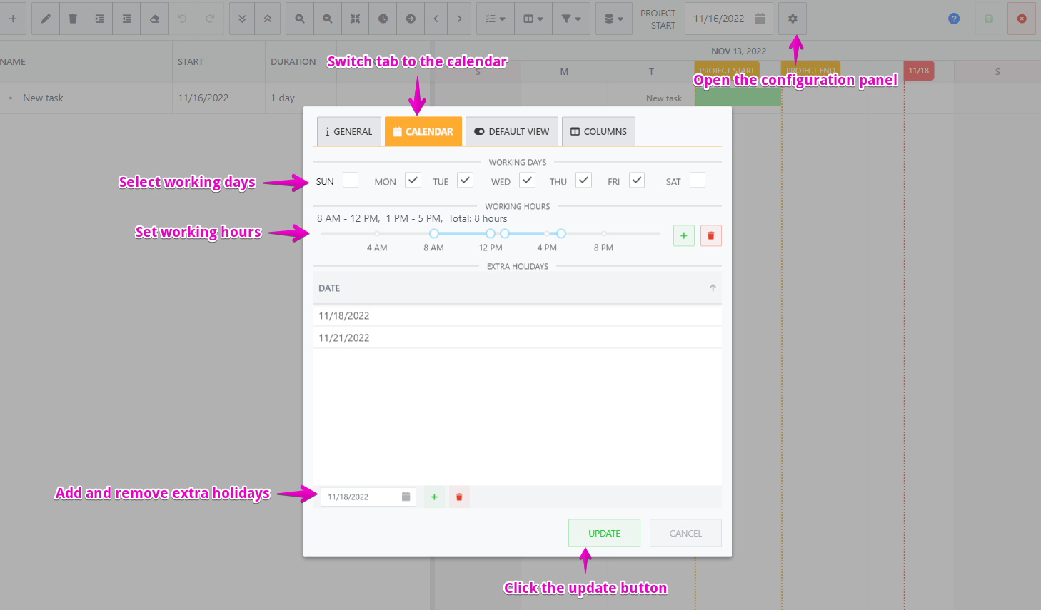 Your Gantt chart has 5 working days as Monday, Tuesday, Wednesday, Thursday, and Friday like the image below.