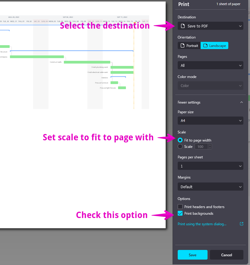 Configure settings. Please make sure to check the Print backgrounds option.