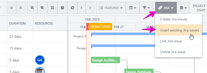Each inserted task will be linked to the Jira issue. So, you can track the Jira issue’s progress in the Gantt Chart. Please see Link tasks to Jira issue to track Jira issue progress for details about the Jira issue linking feature.