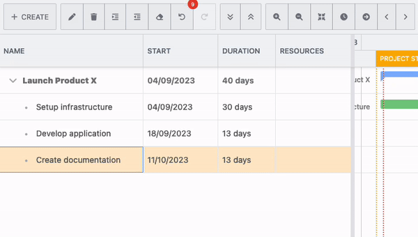 Familiarize yourself with the Gantt chart editor: