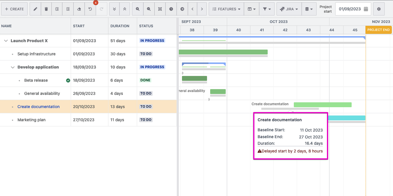 Hovering cursor onto baselines shows insights if the latest schedule is behind the baseline or takes longer than baseline