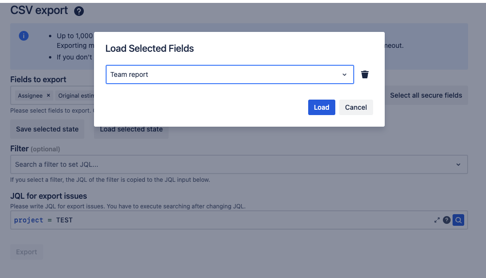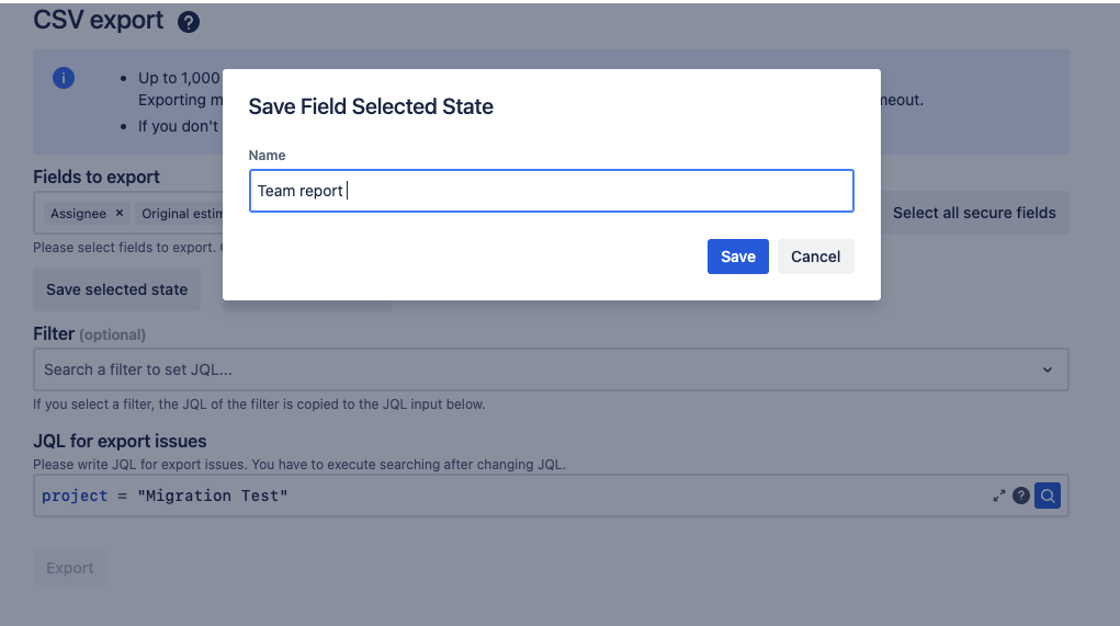 Tip: You can export Jira fields along with secure fields. If you don’t see the desired Jira fields, please raise a request through our support portal.
