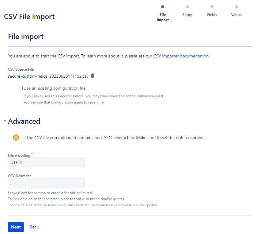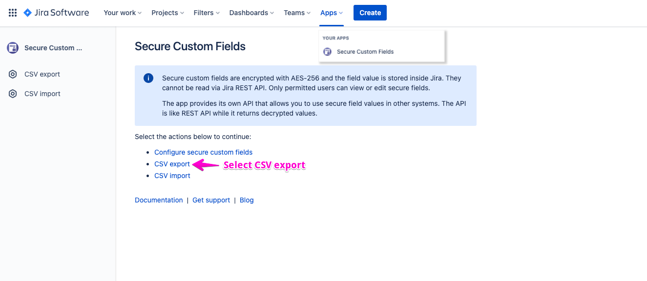 CSV format of Secure custom fields is compatible with Jira’s CSV format so that you can migrate secure field values to standard Jira fields.