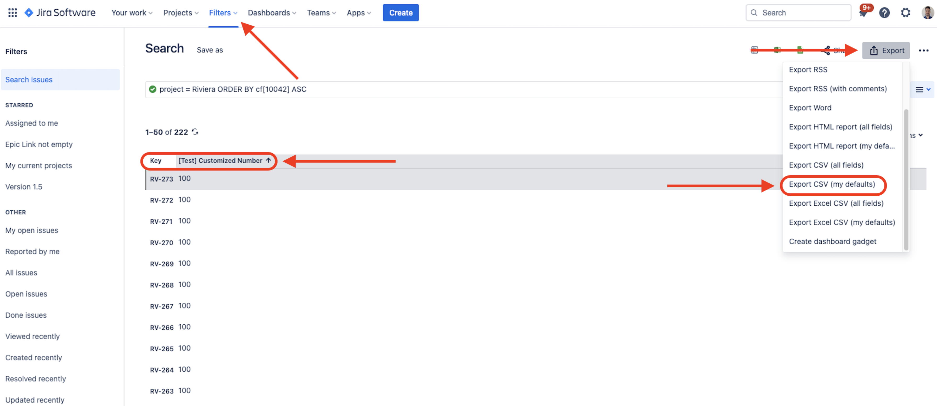 Go to Jira → Filters → Filter your project and keep only Key (mandatory) and your Custom Field on columns → Export → Export CSV (my defaults)