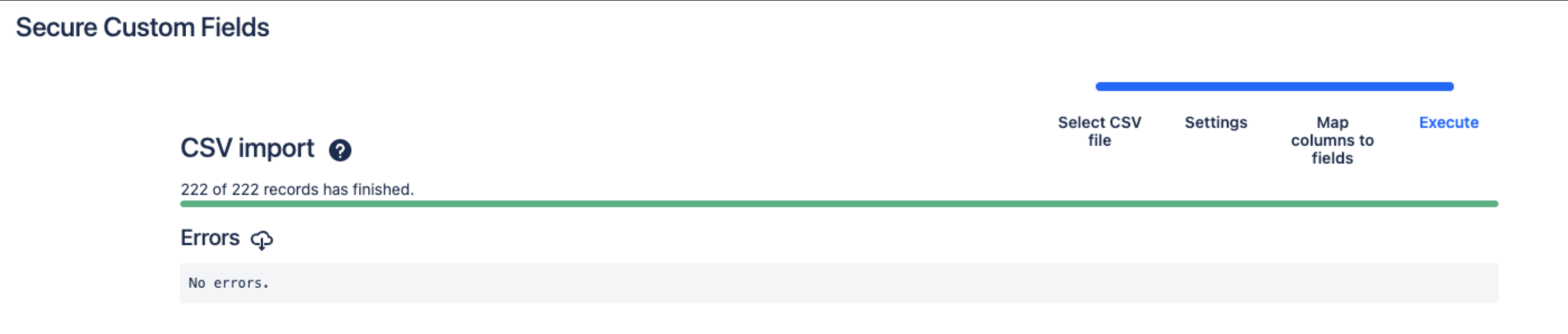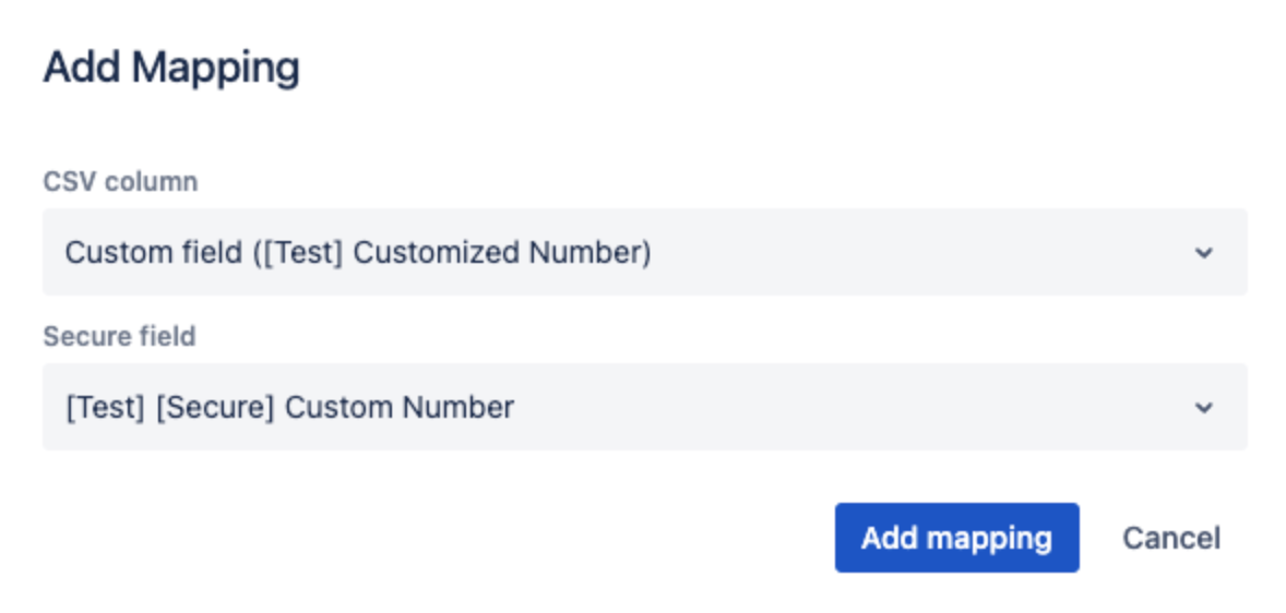 On the next screen, choose Issue key on Issue key column dropdown menu → click Add mapping → on CSV Column, choose the field exported → on Secure Field, choose the Secure Custom Field where data will be stored. In my example, it became as follows