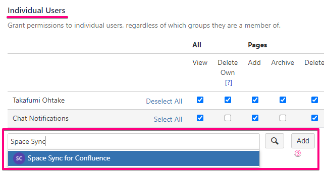 Add “Space Sync for Confluence“ in the “Individual Users” section.
