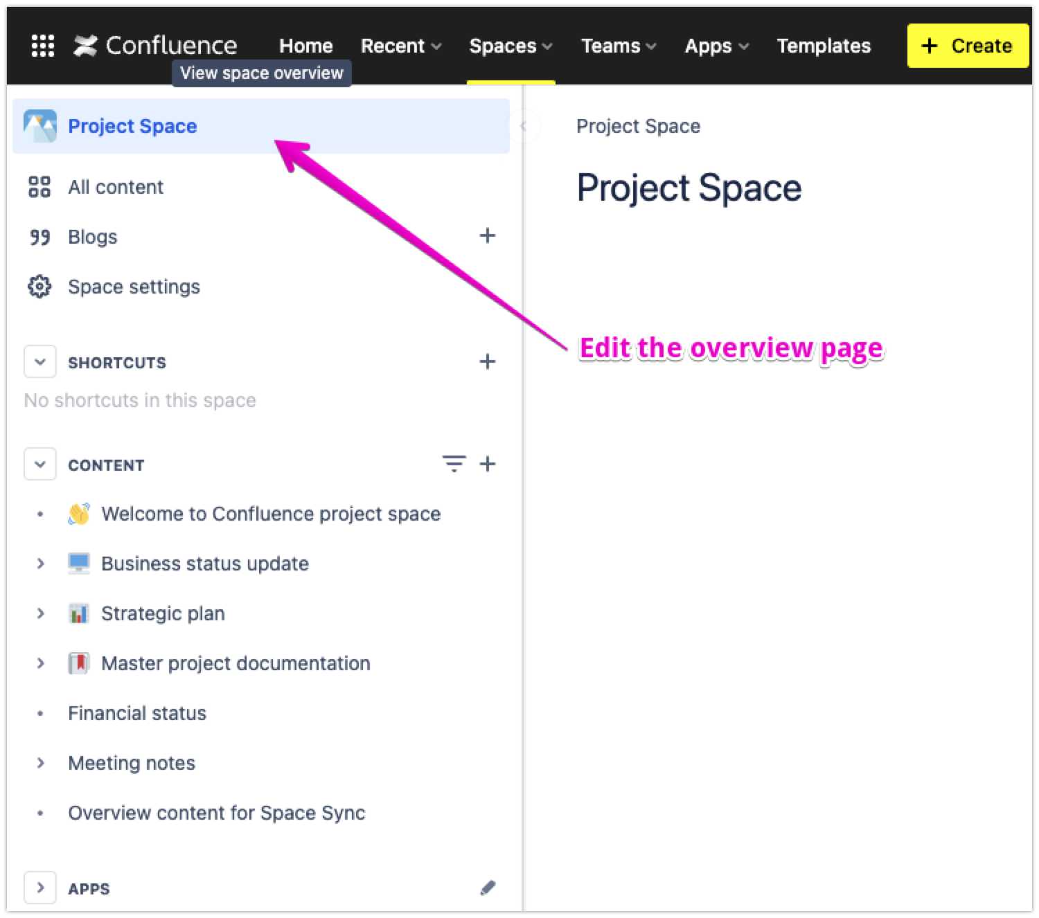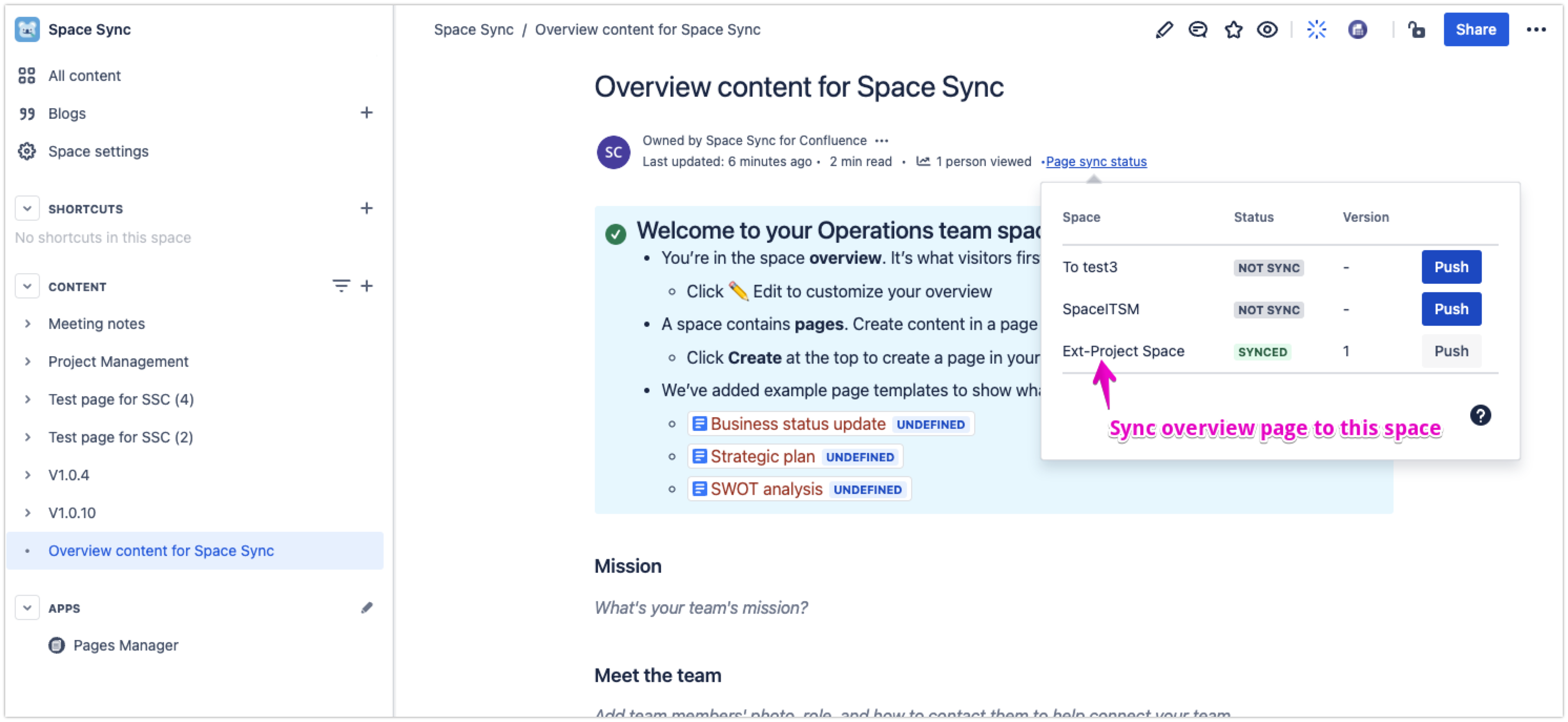 Due to some limitations, the app does not support synchronization of the Overview page. However, users can implement a workaround using the combination of the space sync app and Confluence Include page macro.