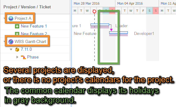 Holidays are taken into account when a plan is changed. If only one project is displayed in WBS Gantt-Chart, and its holiday calendar is configured, the holidays are displayed with a green background. Otherwise, the holidays from the common calendar are displayed with a gray background.
