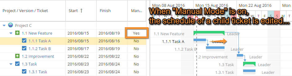 Also, if planned dates are not set for a child issue, Auto-correct schedule may not function correctly. Unless you have a specific reason for not doing so, please ensure you set planned dates.