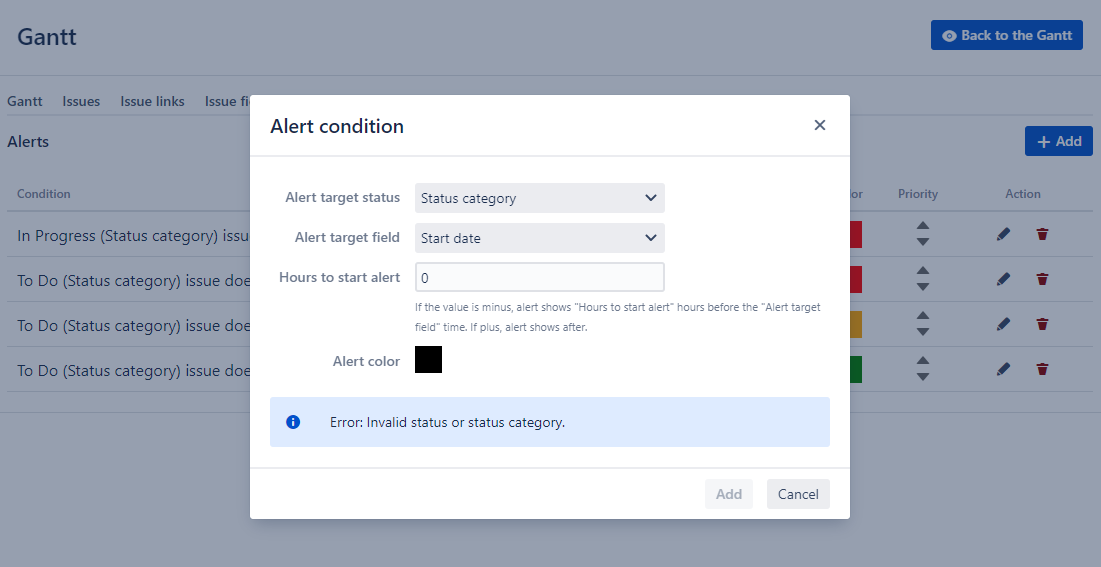 From inside the Gantt chart, click on the Cog icon (at the top-right corner) > Gantt configuration > Alerts