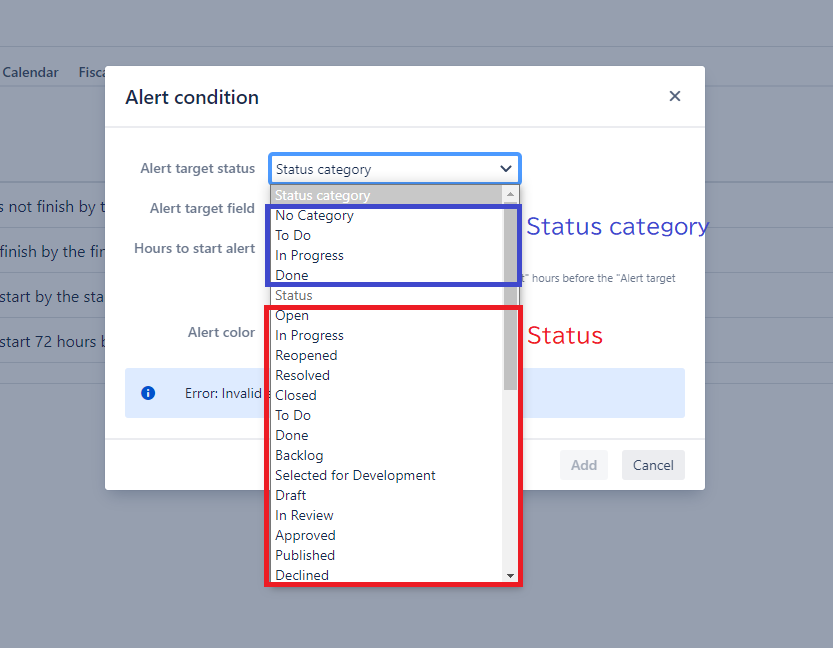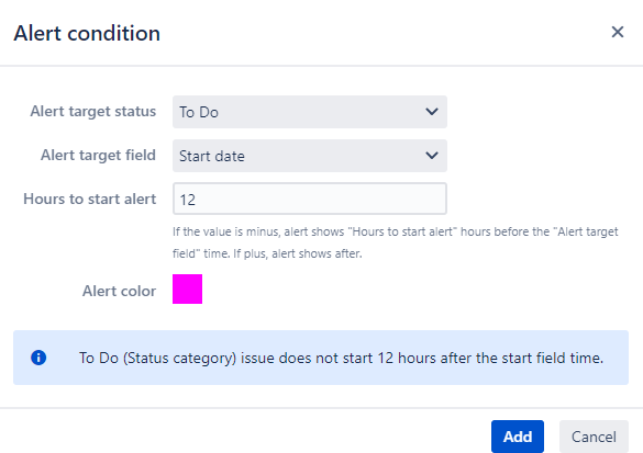 Alert is a function that provides visual notification on the WBS when there is a delay in the progress of issues.