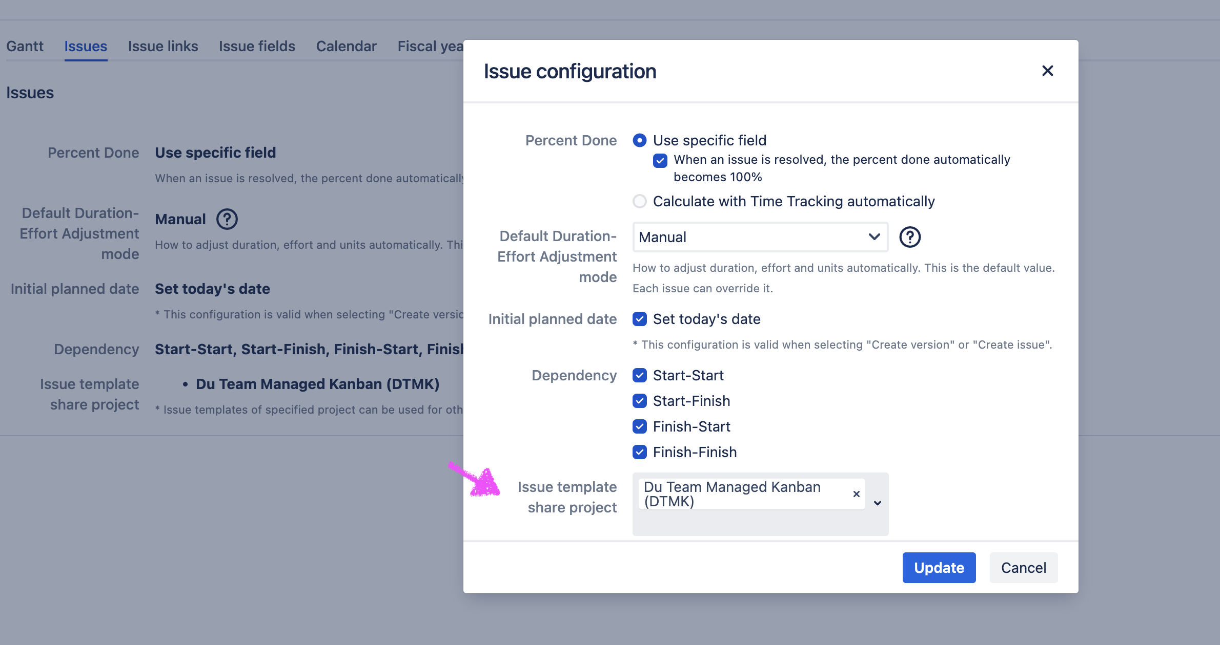 The issue template in the project set here can be read from all the projects displayed on the Gantt chart.