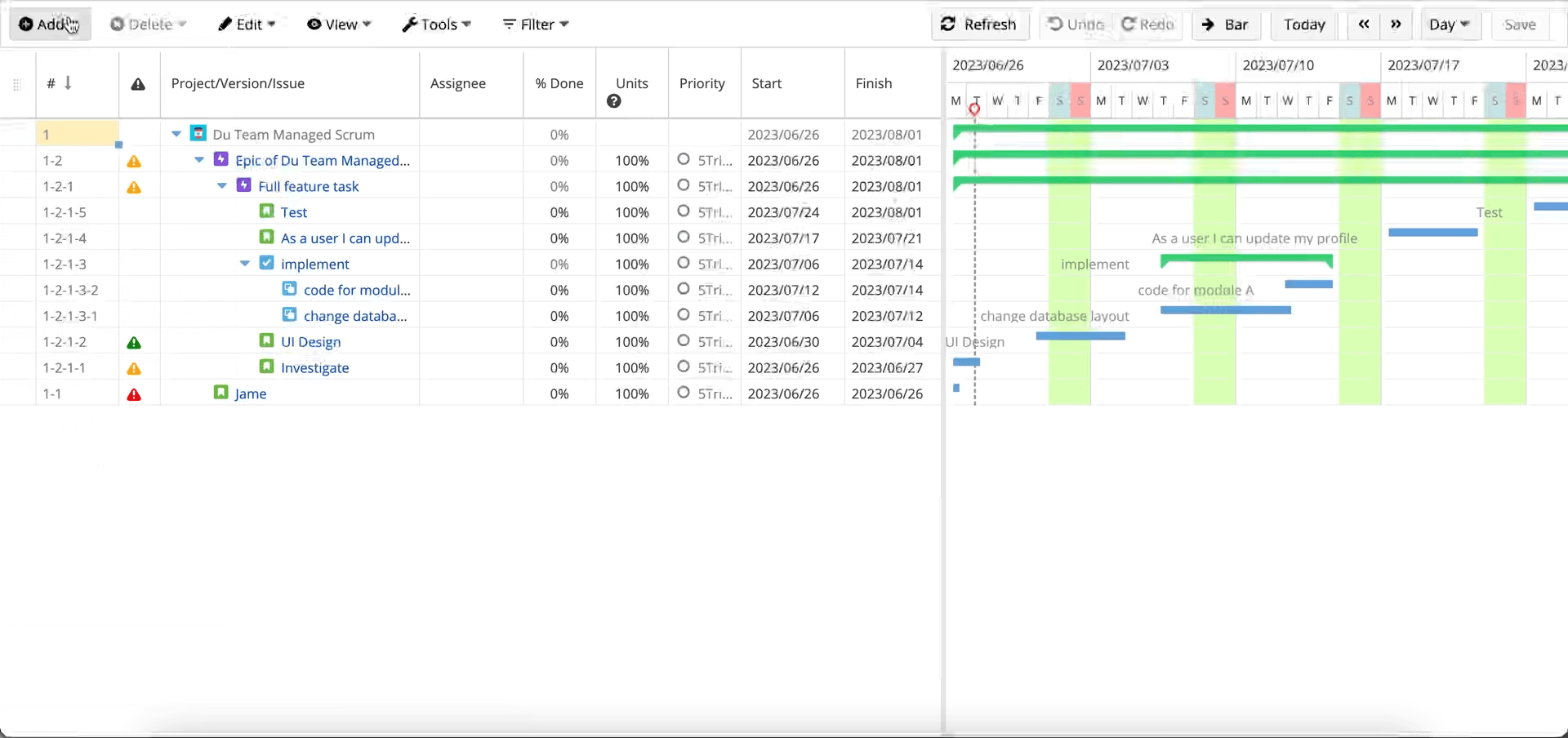 You can create issues on the WBS and Gantt chart screen from the issue template in the specified project and limit the editing of the issue template by setting permissions for the specified project.