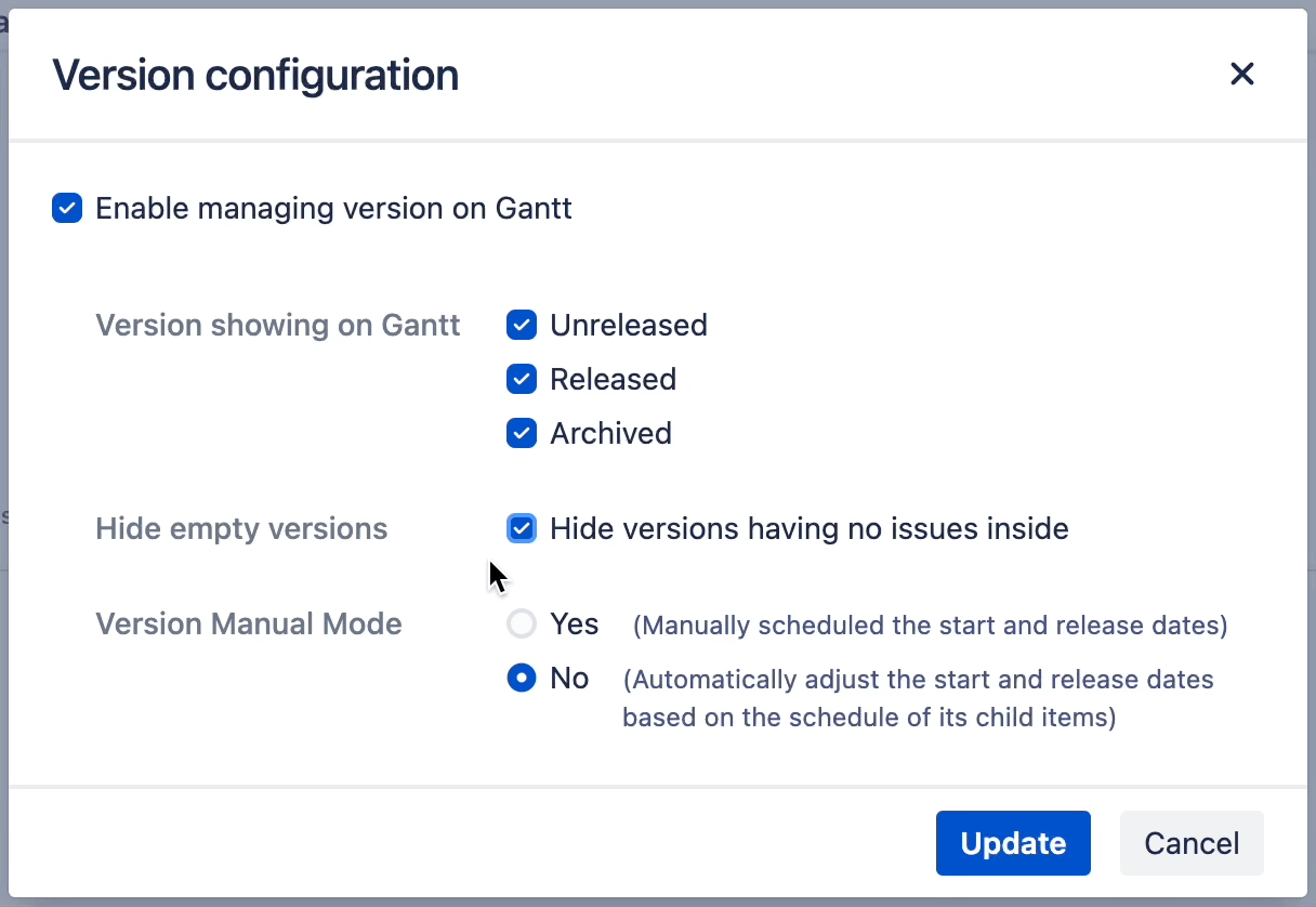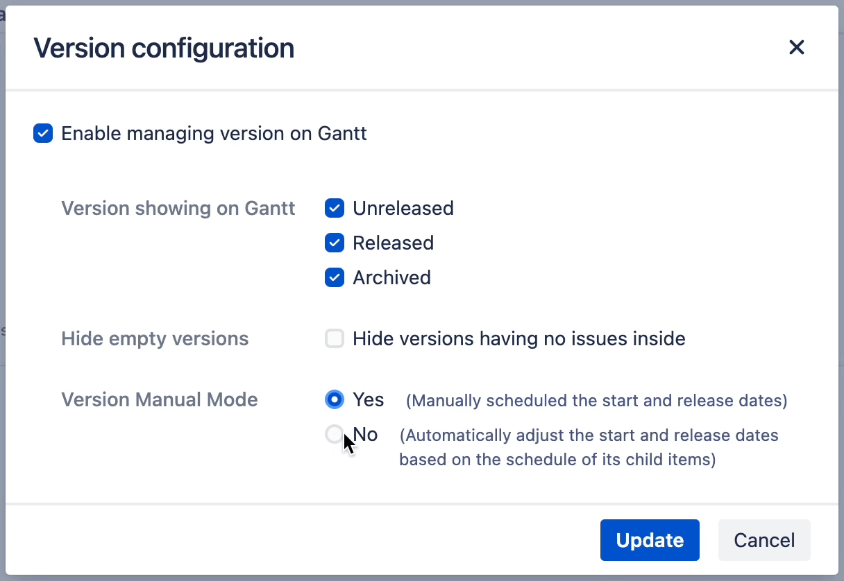 No: Automatically adjust the start and release dates of version based on the schedule of its child items
