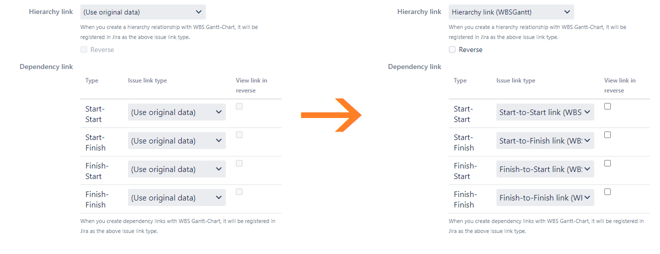 About the Hierarchy link and each Dependency link above, change "(Use original data)" to a specific issue link type.