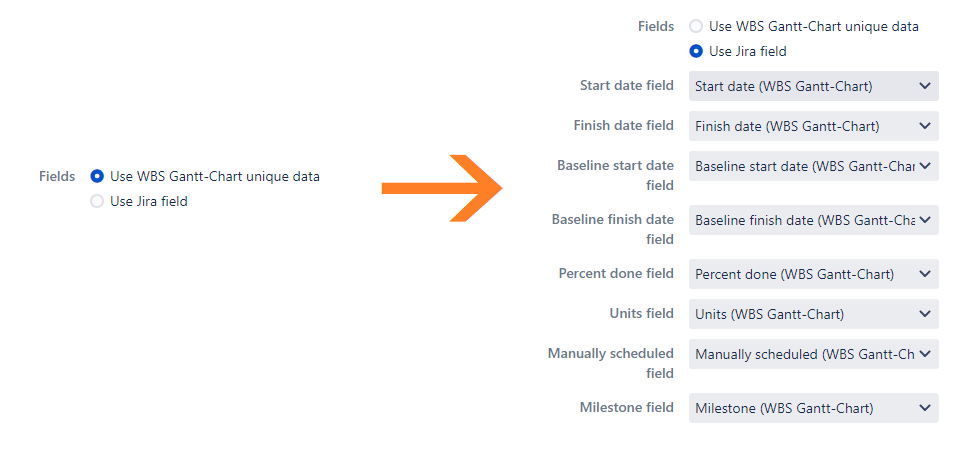 This page explains how to convert the app's own data in WBS Gantt-Chart to Jira issue link/field.