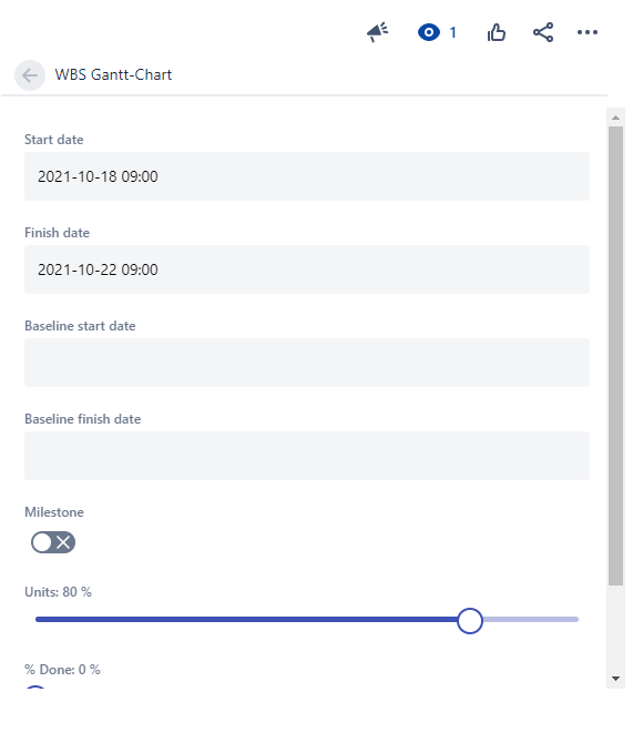 The start and finish date times can be viewed and edited from the panel on the right side of the Issue detail view.