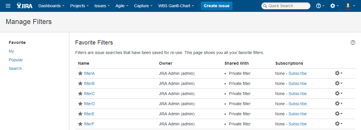 * If Jira is running in http://localhost:8080/, the selected filter is displayed on-screen in Jira, and is also displayed in WBS Gantt-Chart, as shown below.