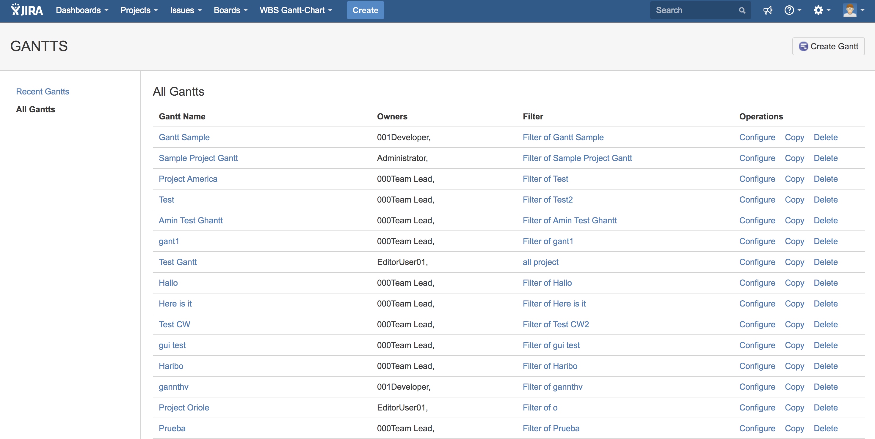 In Gantt, you can display a list of Gantts by selecting View all Gantts.