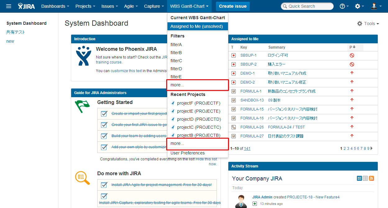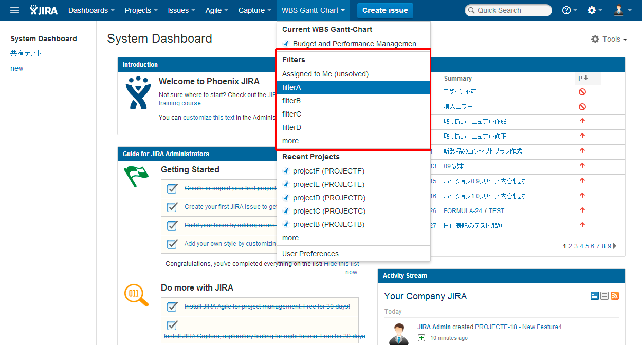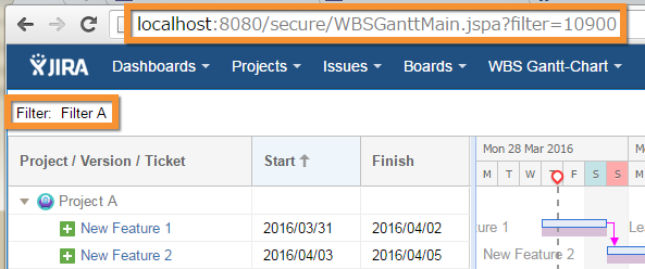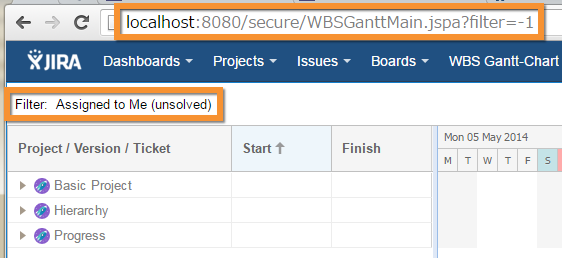* If Jira is running in http://localhost:8080/, the selected filter is displayed on-screen in Jira, and is also displayed in WBS Gantt-Chart, as shown below.