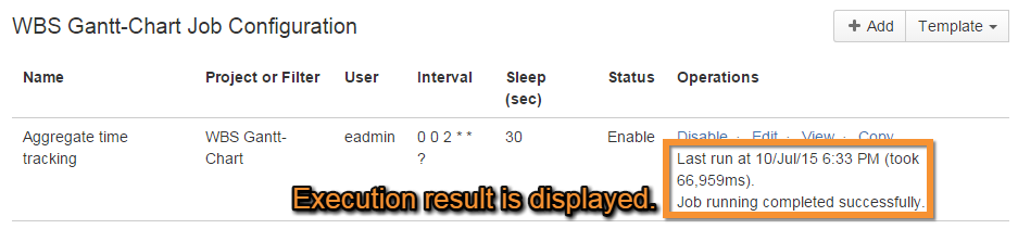 The time spent and the result of the last performed job is displayed under Operations on the job configuration page.