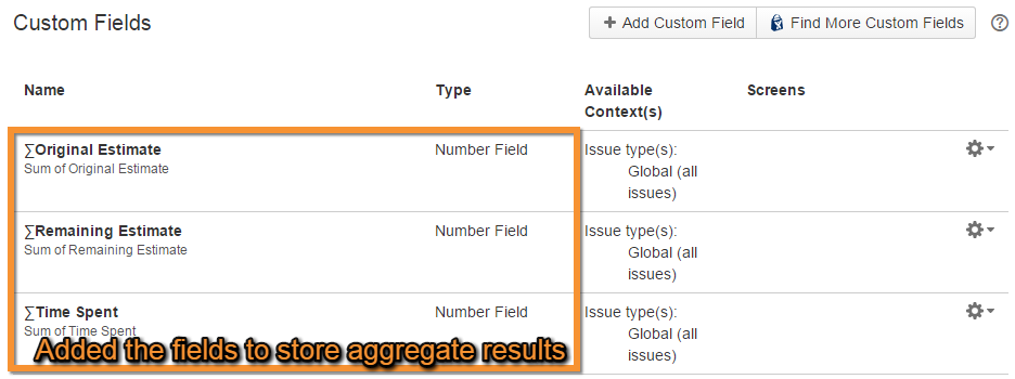 The aggregated results of calculations are stored in the custom fields specified by the tasks. You should create the following custom fields in number field format in advance.