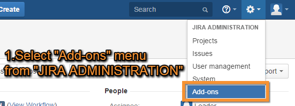 Select Add-ons from the Jira ADMINISTRATION menu shown as the cog icon at the top-right corner.