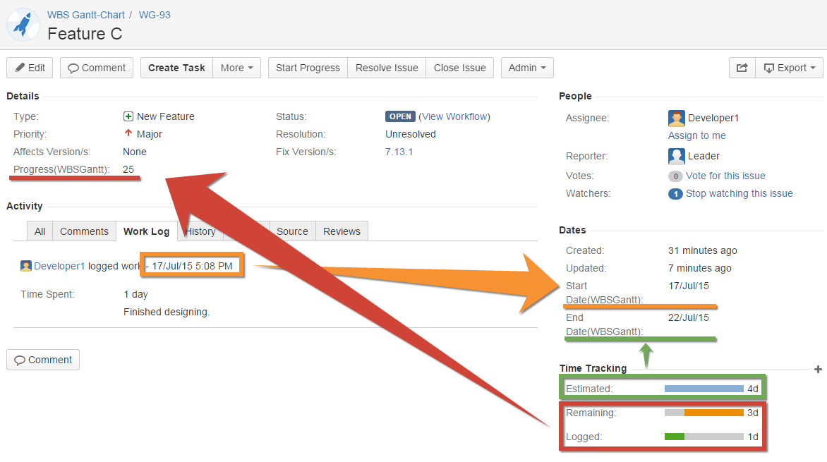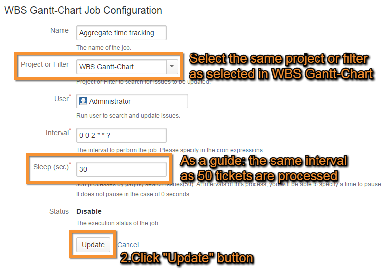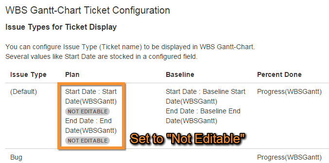 The results of the time tracking calculation are based on the plan start and finish dates and progress rate as configured in the issue settings. However, when plan dates are edited in WBS Gantt-Chart, these are overwritten in the job scheduler. Therefore we recommend that the plan date fields be set to Not Editable.