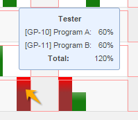 In the resources view you can display a list of assignees, as well resources bars showing time periods horizontally and % workload (units) vertically. A red line (called a 'limit line') indicates the maximum daily workload.