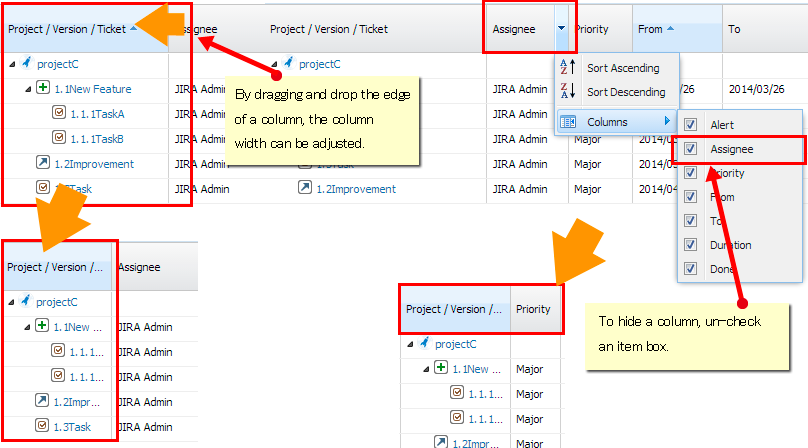To adjust the width of a column, drag the right edge of a column. To hide columns, uncheck the column you wish to hide in the sub-menu of the header menu.