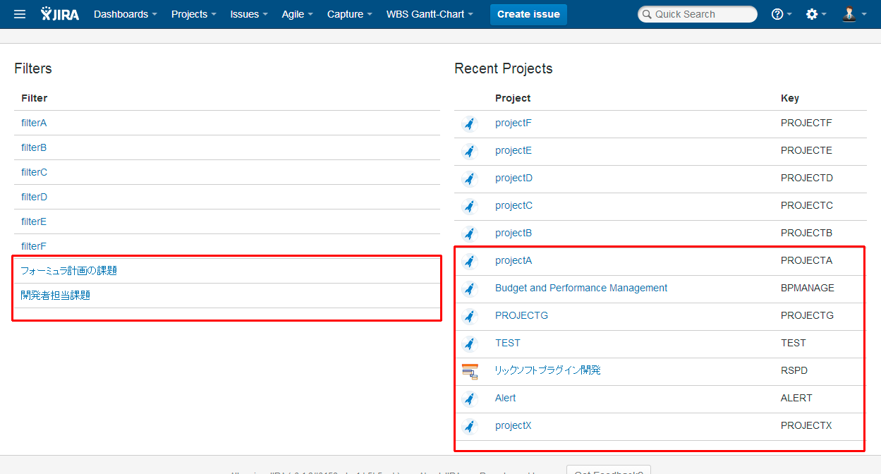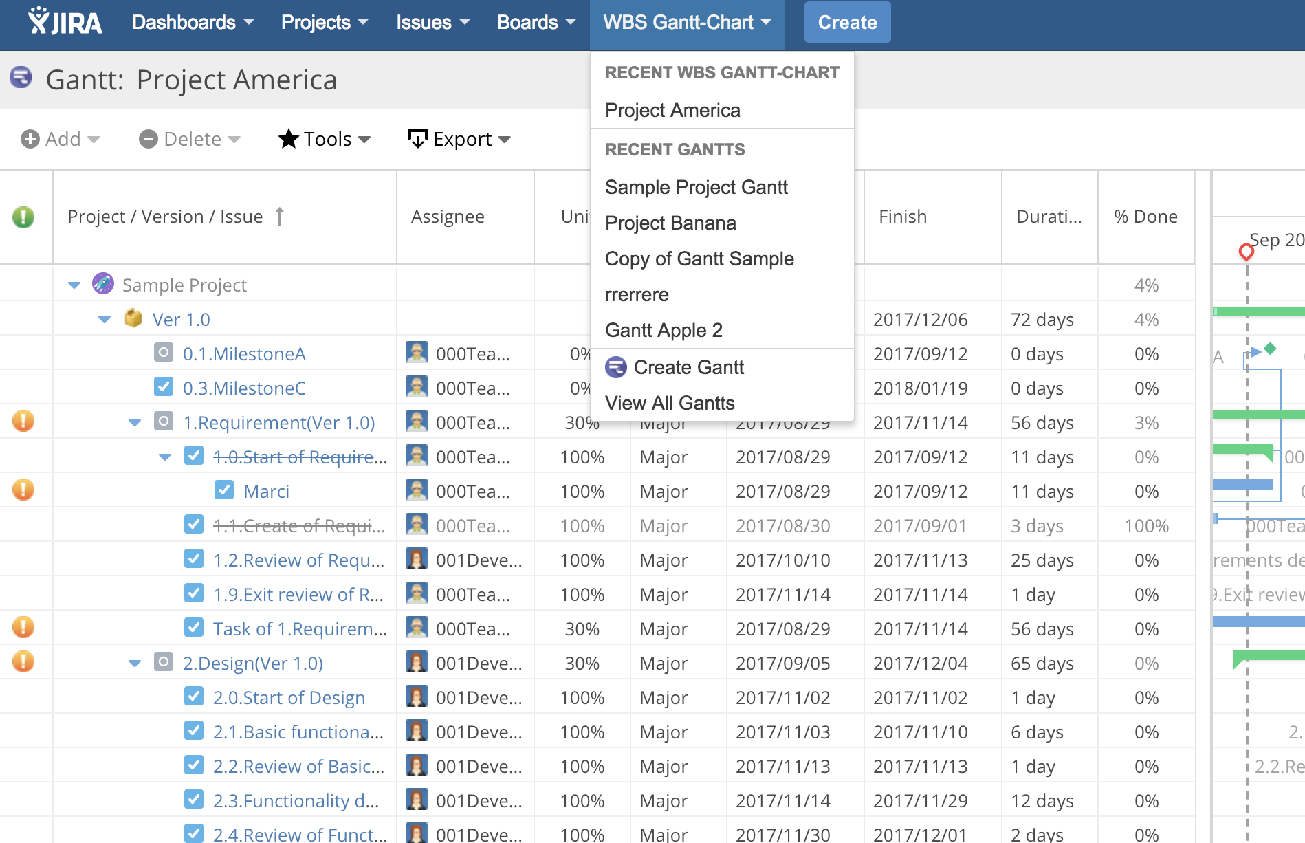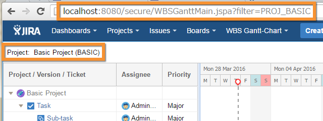 * If Jira is running in http://localhost:8080/, the selected filter is displayed on-screen in Jira, and is also displayed in WBS Gantt-Chart, as shown below.