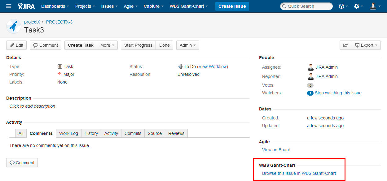 WBS Gantt Chart can also be displayed from an issue detail screen. Click the link Browse this issue in WBS Gantt-Chart in the issue detail screen.