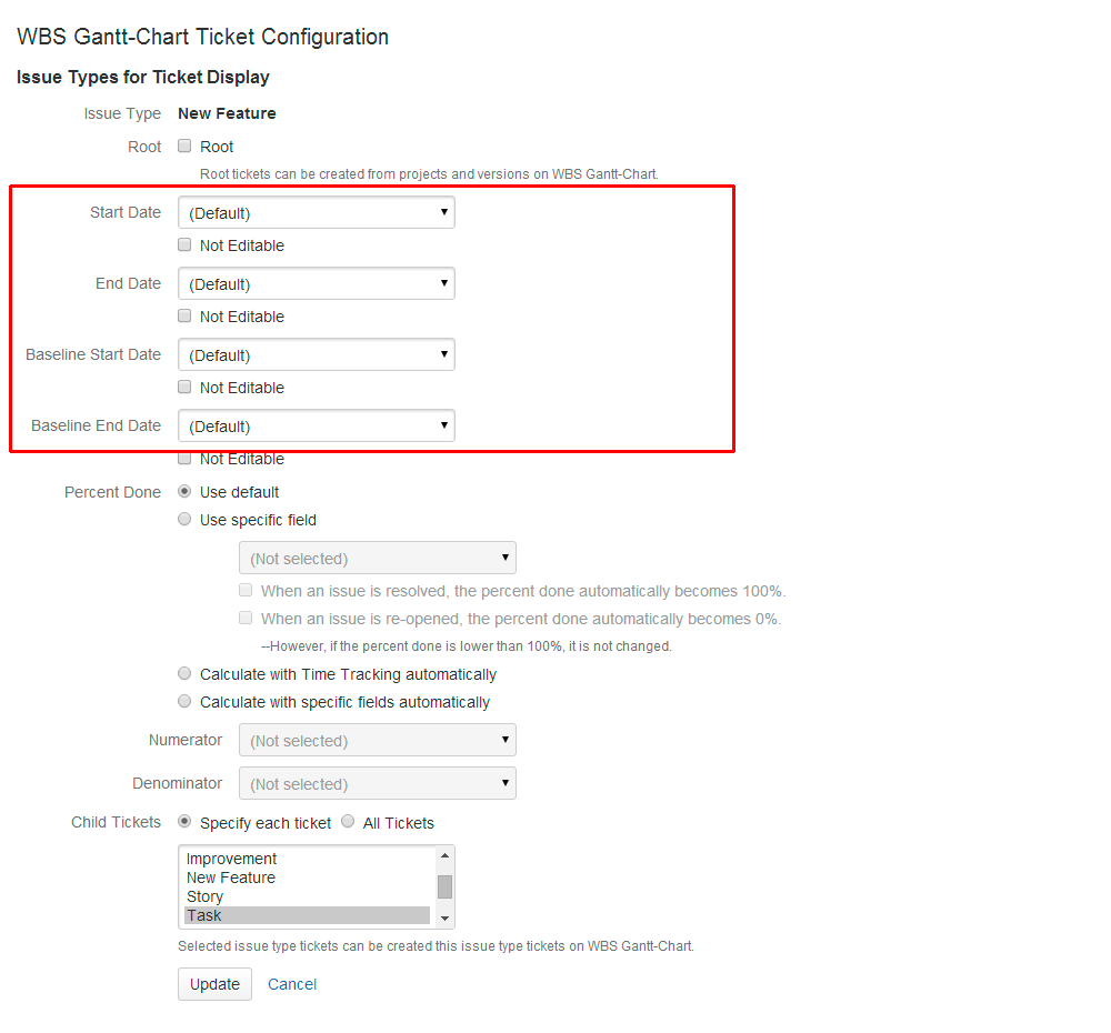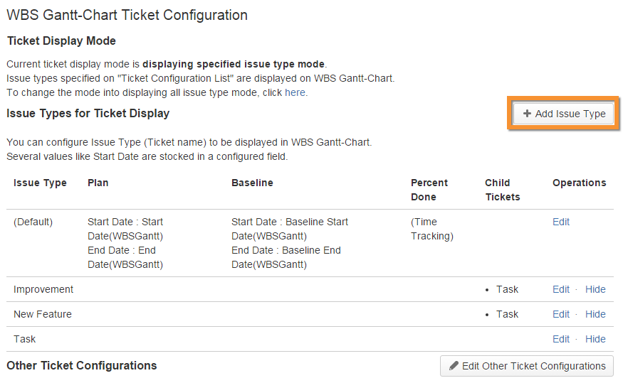 Issue settings, such as plan dates and progress rate (percent done) displayed in WBS, and child issue issue types, can be updated as follows: