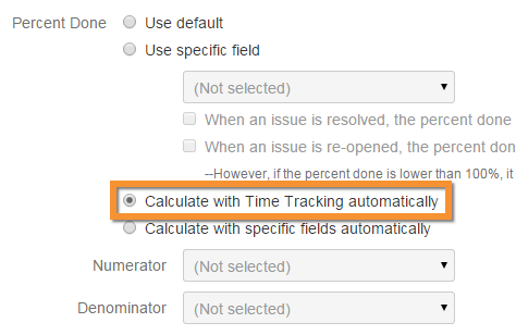 Where the following boxes are checked - When an issue is resolved, the percent done automatically becomes 100% or When an issue is re-opened, the percent done automatically becomes 0% - percent done automatically displays 100% when an issue is resolved, and resets to 0% if an issue is reopened.