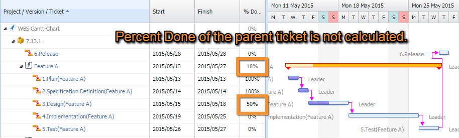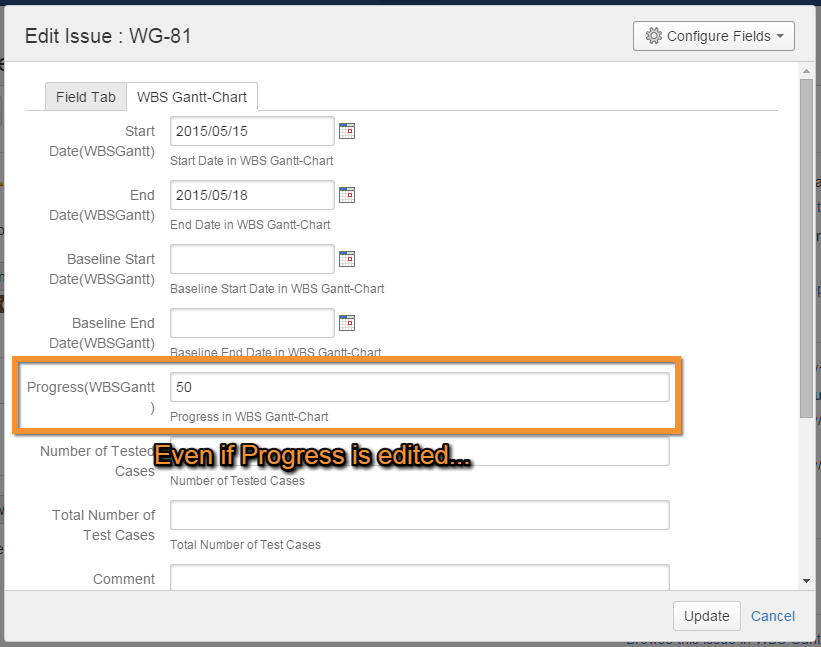 The results of the time tracking calculation are based on the plan start and finish dates and progress rate as configured in the issue settings. However, when plan dates are edited in WBS Gantt-Chart, these are overwritten in the job scheduler. Therefore we recommend that the plan date fields be set to Not Editable.
