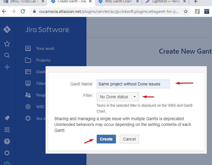 However, it's important to point out that if there are any dependencies related to the Done issues, with this filter, the dependent issues won't be displayed as well. To implement this solution, first, it's necessary to create a new filter and then create a new Gantt using this new filter.